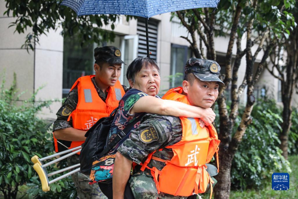 7月14日,在重慶市萬(wàn)州區江南新區,武警重慶總隊執勤第三支隊官兵在轉移群眾。
