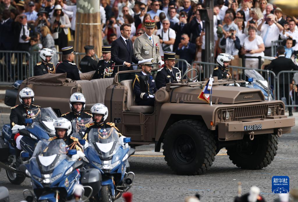 7月14日,法國總統馬克龍抵達巴黎協(xié)和廣場(chǎng)的國慶閱兵式現場(chǎng)。新華社記者 高靜 攝