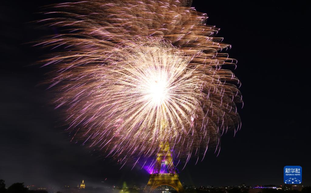 7月14日,焰火在法國巴黎埃菲爾鐵塔周?chē)`放。