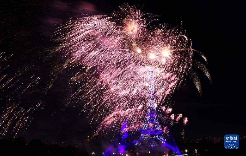 7月14日,焰火在法國巴黎埃菲爾鐵塔周?chē)`放。