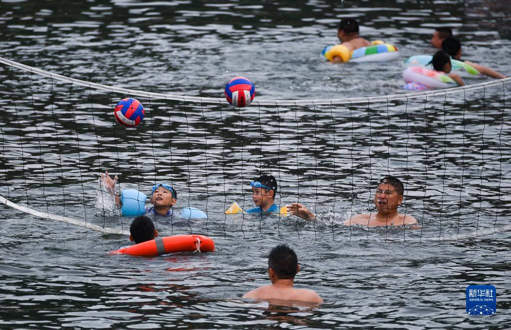 7月14日,游客和村民在乾潭鎮下包村胥溪天然泳場(chǎng)戲水,感受夏日清涼。