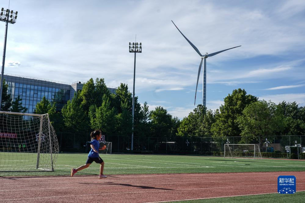 7月14日,小女孩在園區操場(chǎng)上跑步,遠處是風(fēng)力發(fā)電設備。