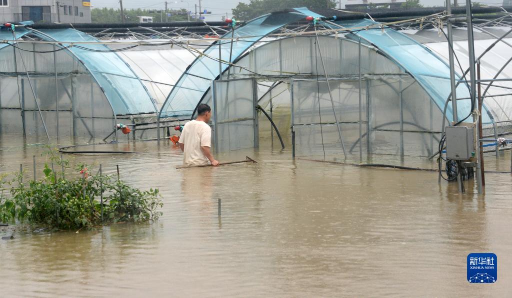 7月15日,在韓國全羅北道完州郡,一名男子檢查被雨水淹沒(méi)的塑料大棚。
