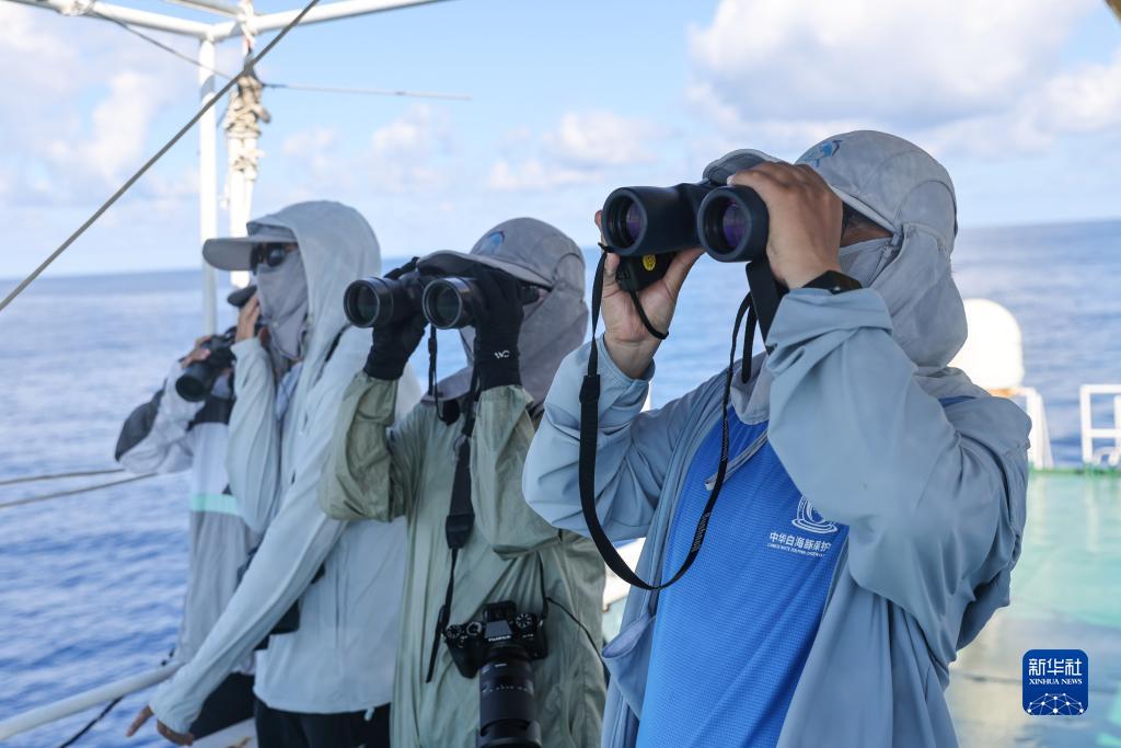 7月10日,第六次南海深潛及遠海鯨類(lèi)科考航次的科研人員在南海某海域進(jìn)行目視觀(guān)測。