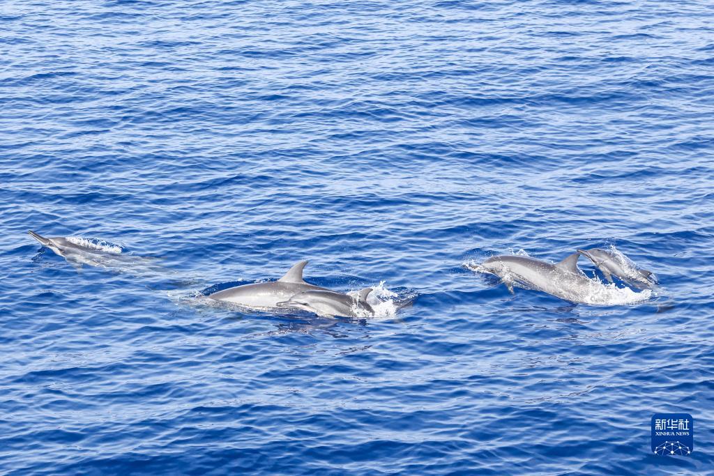 這是7月7日在南海某海域拍攝的長(cháng)吻飛旋海豚。