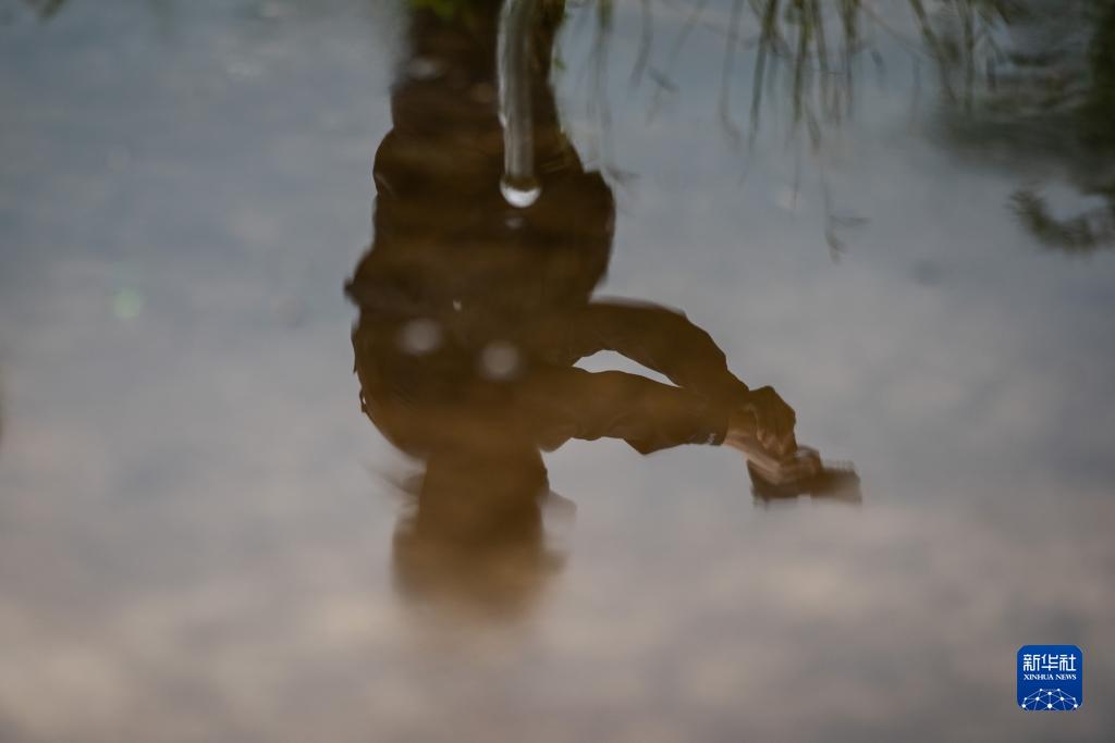 7月13日,尹銘燕在進(jìn)行射擊訓練,地面的水洼映出她的倒影。