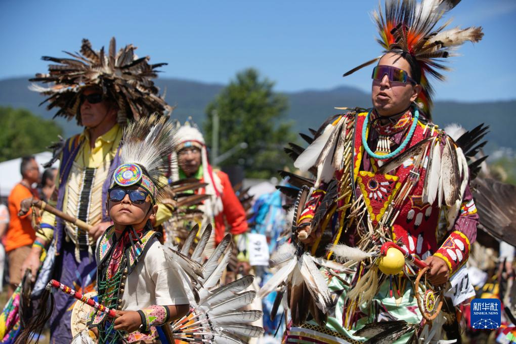 7月15日,在加拿大溫哥華,穿著(zhù)傳統盛裝的印第安原住民參加“帕瓦”活動(dòng)。