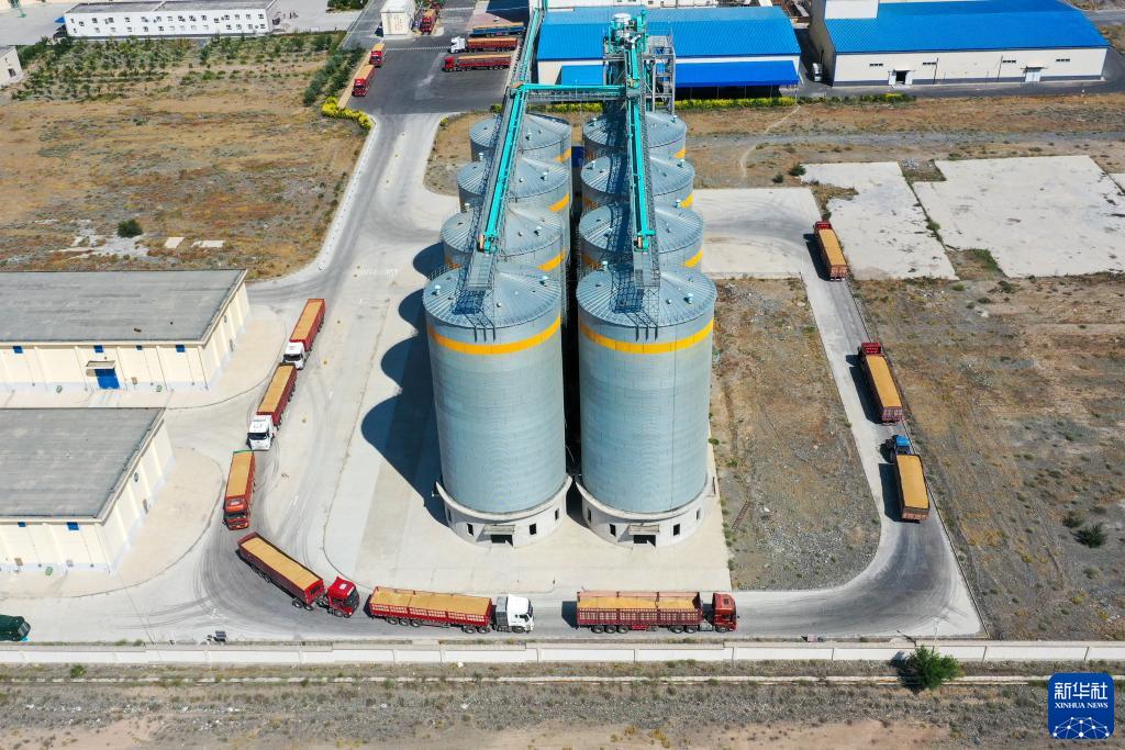 運糧車(chē)在新疆呼圖壁縣一家糧食收購企業(yè)外排隊等待卸糧(7月15日攝,無(wú)人機照片)。