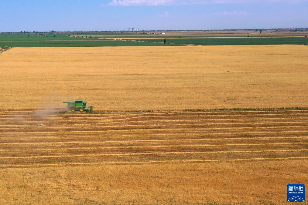 農機手駕駛聯(lián)合收割機在新疆呼圖壁縣二十里店鎮寧州戶(hù)村收割小麥(7月15日攝,無(wú)人機照片)。