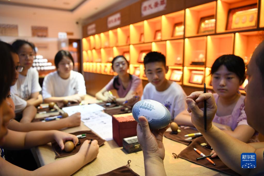 7月15日,學(xué)生在河北省涿州市蒲氏蛋雕非遺傳承館內學(xué)習蛋雕制作技藝。