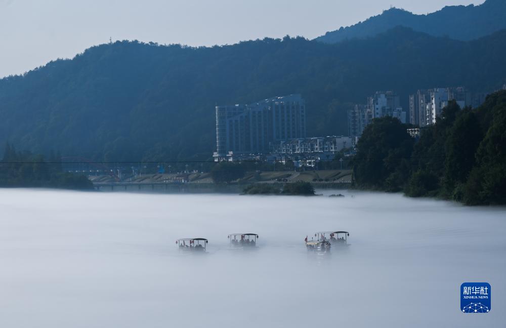 盛夏時(shí)節,浙江省建德市新安江景區推出特色清涼漂流,“竹筏”型游船視野更開(kāi)闊、親水性更佳。新安江水質(zhì)清澈,水溫常年在12-17℃,當江水與空氣溫差較大時(shí),便會(huì )在江面上形成一層霧氣。每年夏季的清晨和傍晚,清涼的新安江水和江上夢(mèng)幻奇霧吸引各地游客前來(lái)避暑度假。