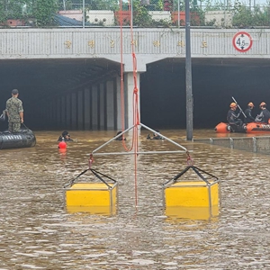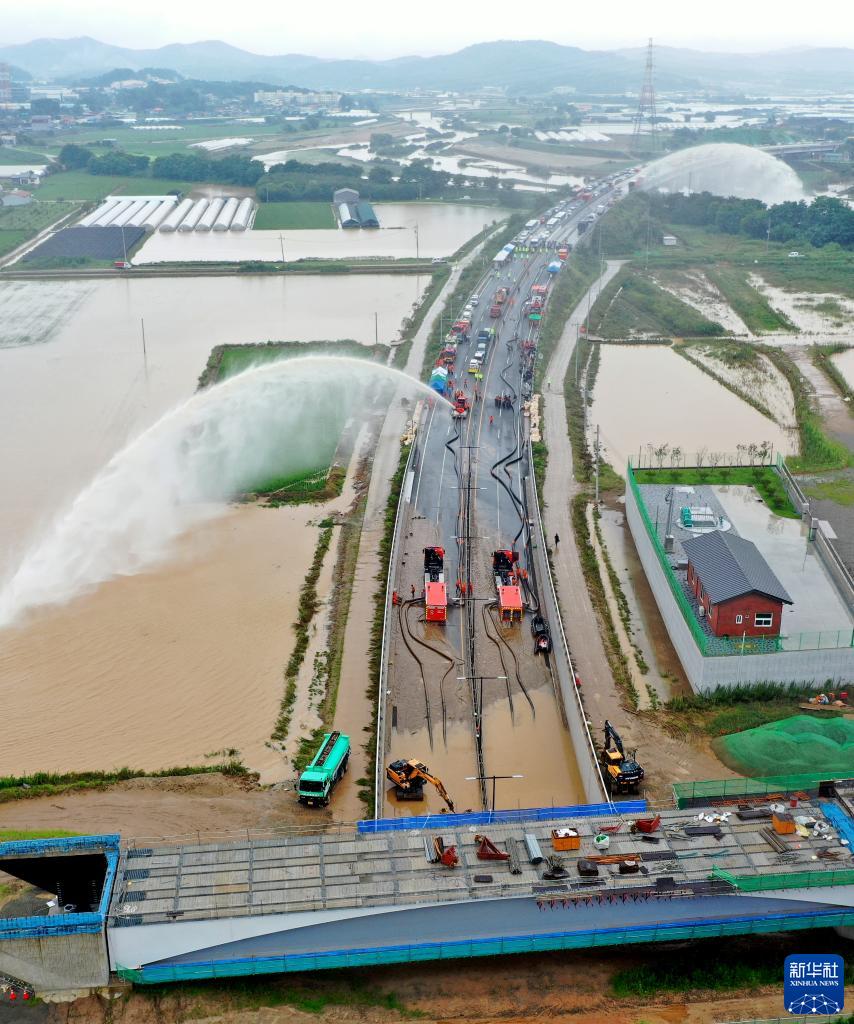 7月16日,在韓國忠清北道清州市,救援人員進(jìn)行抽水和搜救作業(yè)(無(wú)人機照片)。