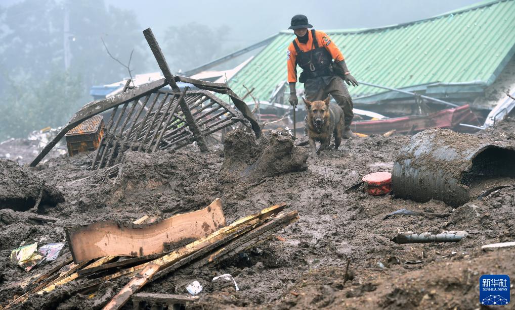 7月16日,在韓國慶尚北道醴泉郡,救援人員在因暴雨引發(fā)山體滑坡的村莊內搜救。