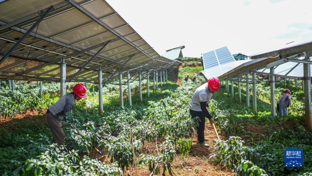 村民在貴州金元木科農業(yè)光伏電站光伏板下的土地種植辣椒(7月5日攝)。