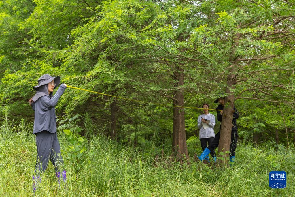 在重慶市忠縣,中國科學(xué)院成都山地所科研人員在測量三峽水庫消落帶池杉的生長(cháng)情況(7月6日攝)。