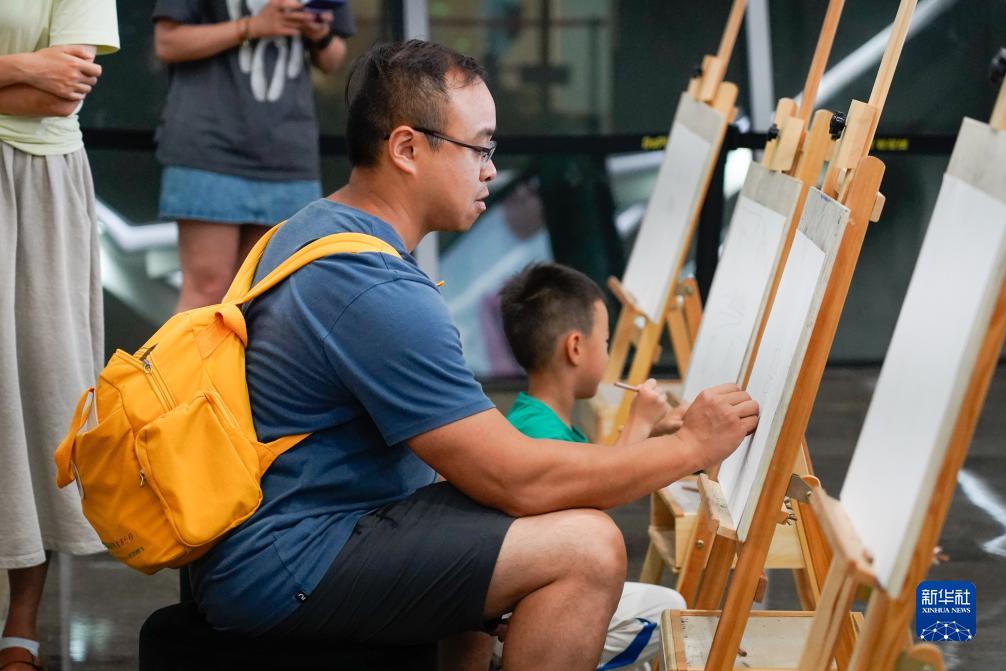 7月16日晚,參觀(guān)者在世博會(huì )博物館藝術(shù)互動(dòng)區體驗作畫(huà)。