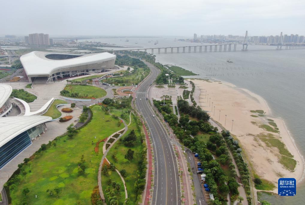 7月17日,臺風(fēng)來(lái)臨前夕,在廣東湛江奧林匹克體育中心附近,車(chē)輛游人稀少(無(wú)人機照片)。