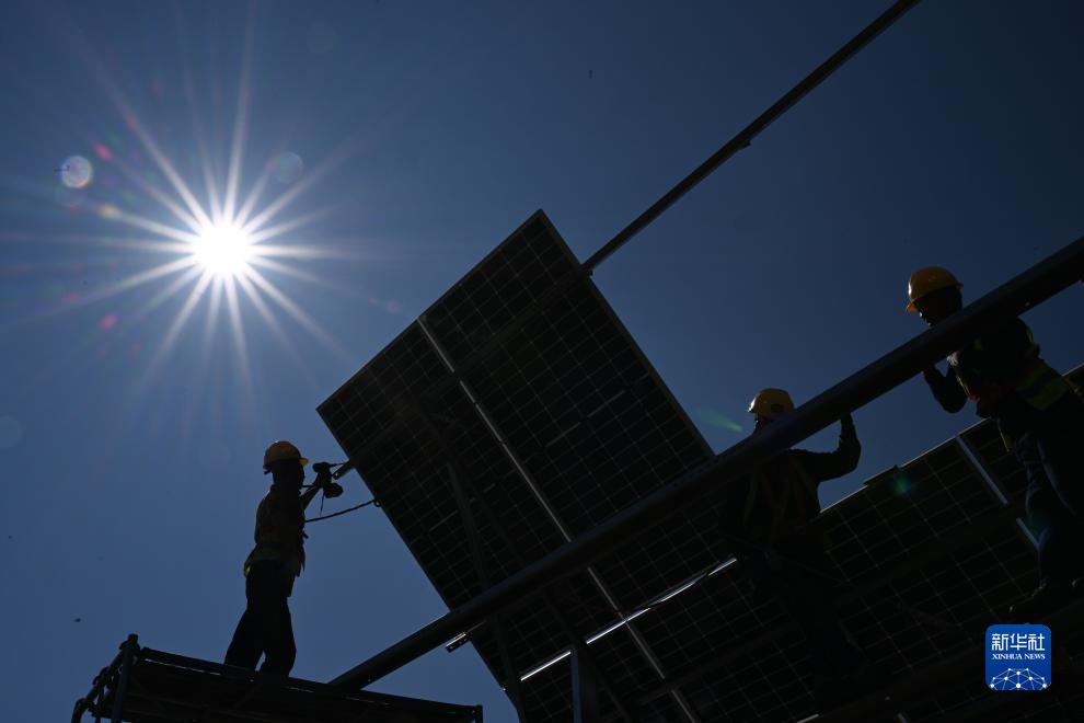7月17日,工人在圍場(chǎng)一處“牧光互補”光伏發(fā)電場(chǎng)安裝太陽(yáng)能板。