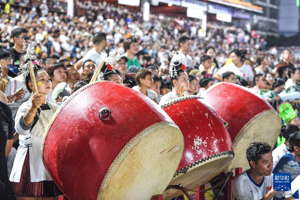 7月15日,拉拉隊在貴州“村超”足球賽場(chǎng)邊擊鼓助威。