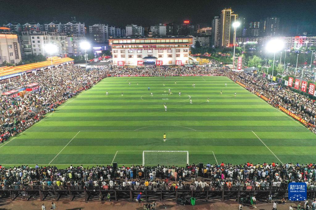 7月15日,人們在觀(guān)看貴州“村超”足球賽(無(wú)人機照片)。