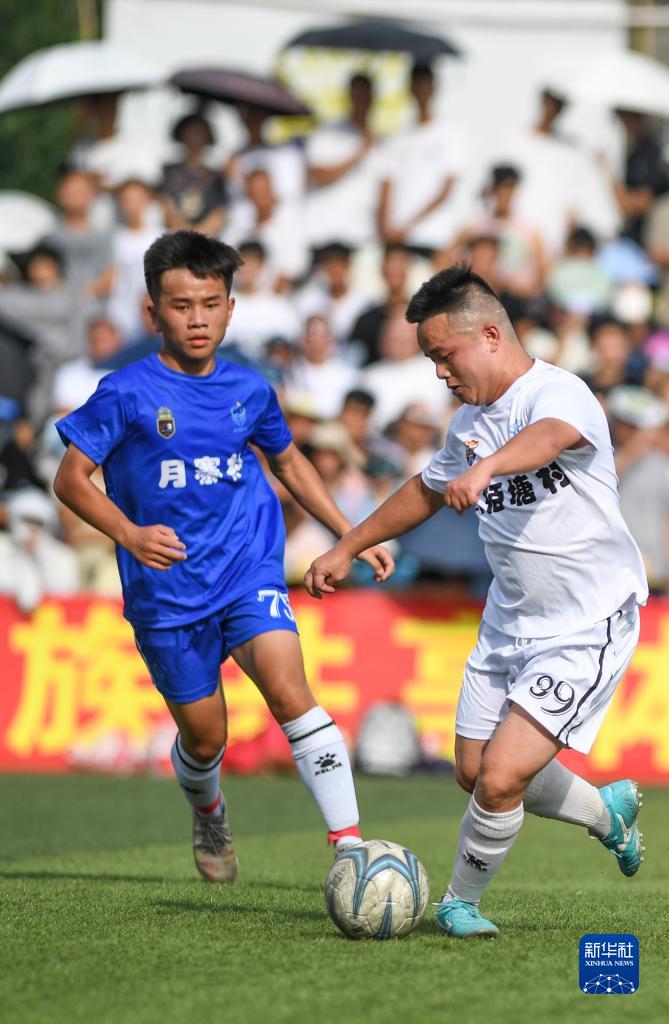 7月15日,六佰塘村足球隊球員楊宗維(右)在與月寨村足球隊的比賽中拼搶。