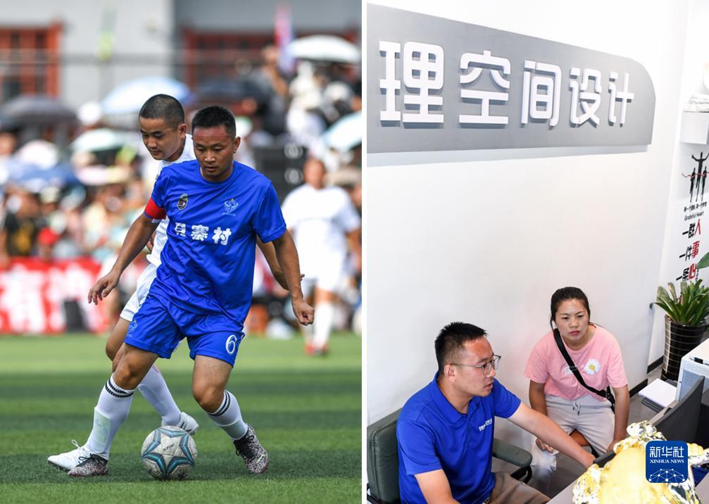 拼版照片:左圖為7月15日,月寨村足球隊球員李遠攀在賽場(chǎng)上拼搶?zhuān)挥覉D為7月16日,李遠攀(左)在裝修設計公司給客戶(hù)講解電腦設計圖。李遠攀是一名室內裝修設計師,也是月寨村足球隊隊長(cháng)。