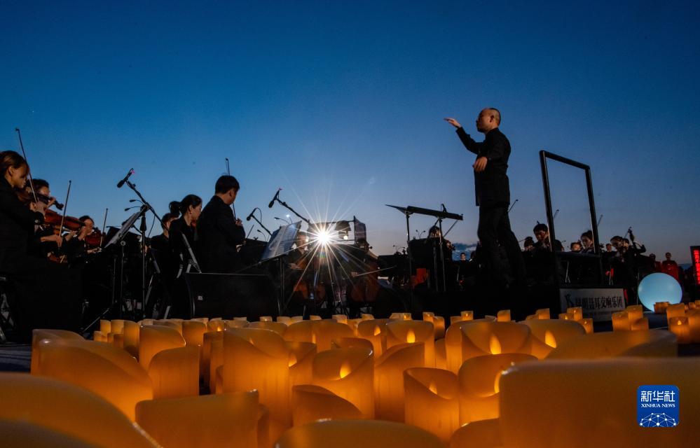 來(lái)自昆明聶耳交響樂(lè )團及昆明市民族歌舞劇院民樂(lè )團的演奏家們在昆明市滇池畔共同演奏包括《義勇軍進(jìn)行曲》《賣(mài)報歌》在內的聶耳代表作(7月17日攝)。