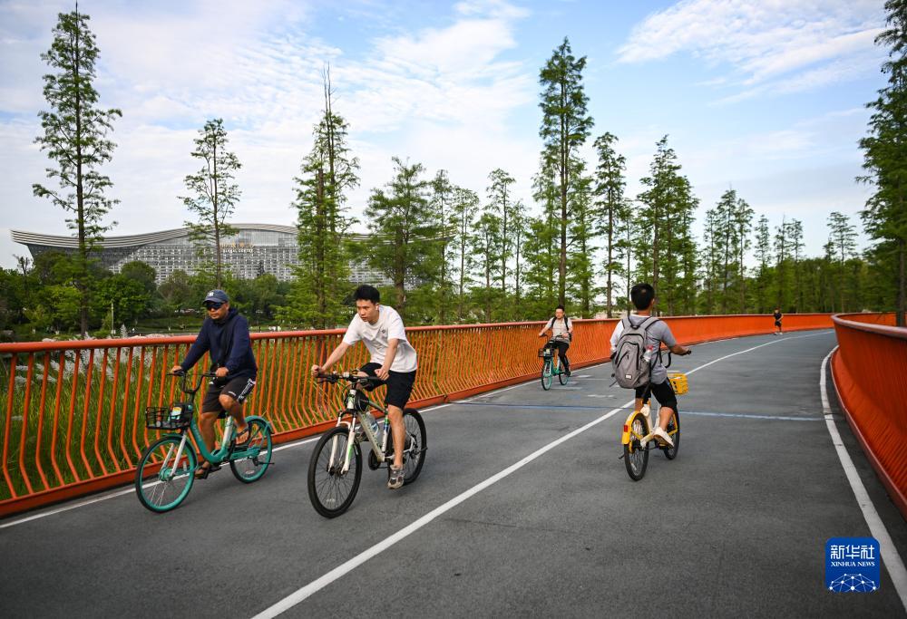 7月14日,體育愛(ài)好者在成都高新區錦城湖公園騎行。