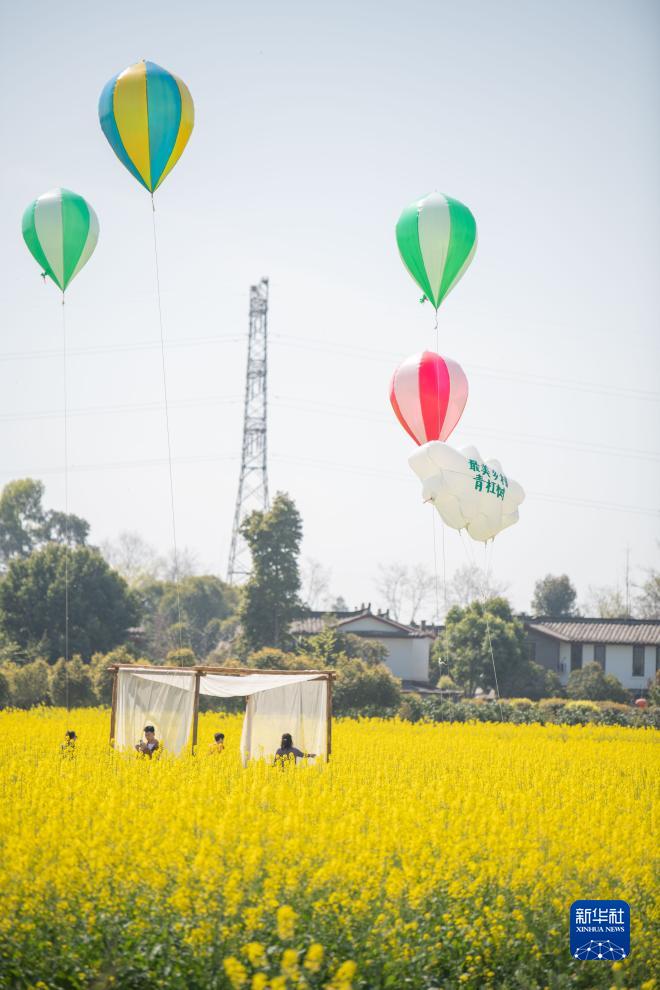在成都市郫都區青杠樹(shù)村,人們在油菜花田里游玩(3月13日攝)。