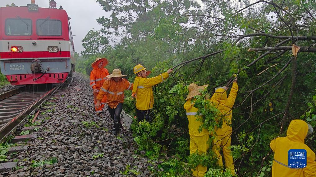 7月18日,國鐵南寧局沿海鐵路公司職工在清理被臺風(fēng)吹倒的樹(shù)木。當日,國鐵南寧局沿海鐵路公司組織職工利用軌道車(chē),在風(fēng)雨中對西部陸海新通道鐵路沿線(xiàn)進(jìn)行巡檢,對線(xiàn)路和防洪重點(diǎn)處所進(jìn)行全面巡查,及時(shí)處理危竹危樹(shù)、接觸網(wǎng)設備隱患等問(wèn)題,全力確保鐵路運行安全。