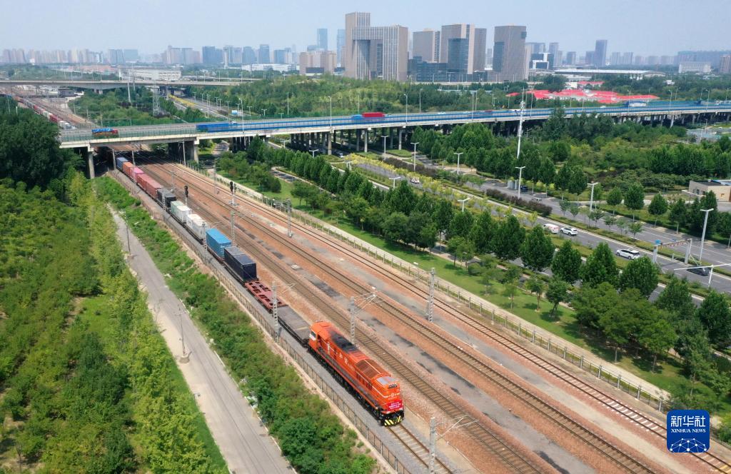 7月18日,X8003次中歐班列(中豫號)駛出國鐵集團鄭州局圃田車(chē)站(無(wú)人機照片)。