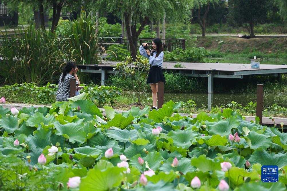 7月18日,游客在杭州富陽(yáng)廣吉生態(tài)農業(yè)基地的荷花池邊拍照。位于杭州市富陽(yáng)區銀湖街道坑西村的廣吉生態(tài)農業(yè)基地是由回歸的新鄉賢創(chuàng )辦,是一家集水產(chǎn)養殖、垂釣、餐飲、觀(guān)光于一體的農文旅休閑產(chǎn)業(yè)基地。