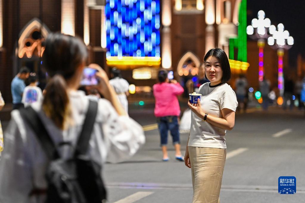 夜幕降臨,在新疆阿勒泰地區布爾津縣七彩河畔,3D全息投影技術(shù)水幕全息燈光秀表演吸引大批游客駐足觀(guān)看。