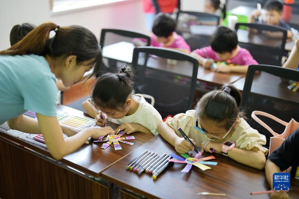 7月19日,孩子們在河北省唐山市豐南區新華社區開(kāi)辦的“愛(ài)心暑托班”上學(xué)習手工制作。
