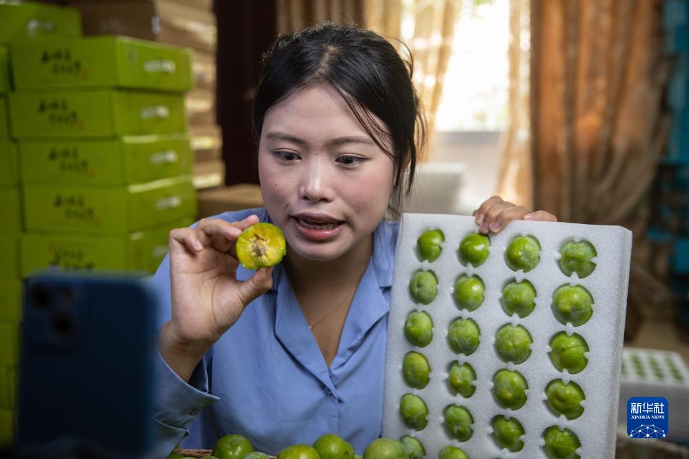 6月30日,在重慶市巫山縣曲尺鄉柑園村,主播劉嘉陵通過(guò)網(wǎng)絡(luò )直播售賣(mài)巫山脆李。