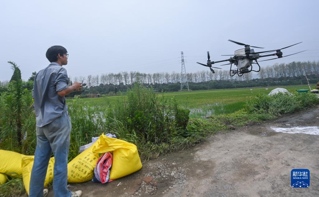7月19日,在湖州市東林鎮保永村,種糧大戶(hù)用植保無(wú)人機為稻田施肥。