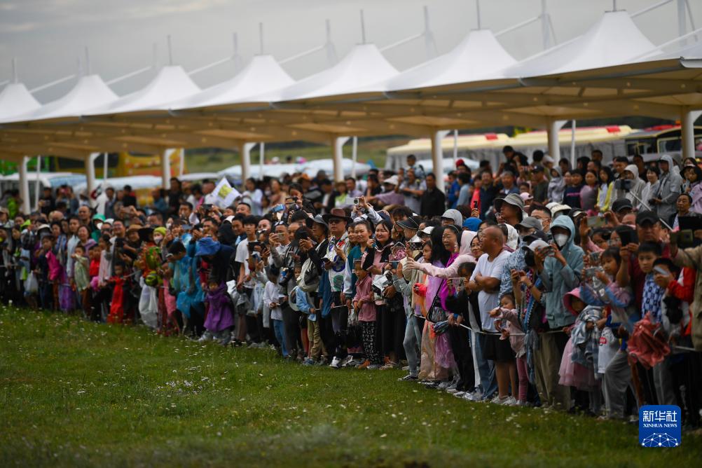 游客在新疆伊犁哈薩克自治州昭蘇縣濕地公園景區觀(guān)看牧民表演(7月17日攝)。