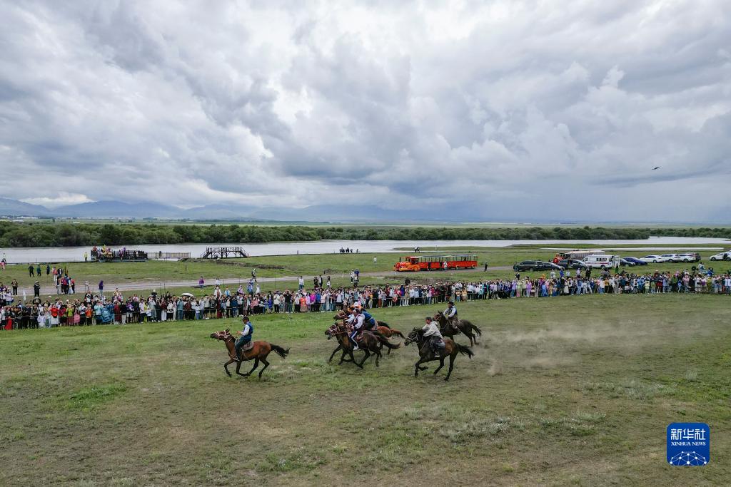 游客在新疆伊犁哈薩克自治州昭蘇縣濕地公園景區觀(guān)看民俗表演(7月17日攝,無(wú)人機照片)。