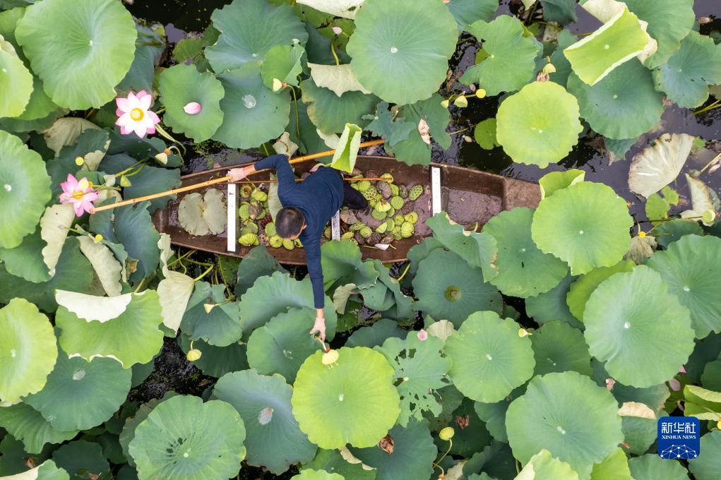 7月19日,在南縣華閣鎮光復漁村,村民在采收蓮蓬(無(wú)人機照片)。