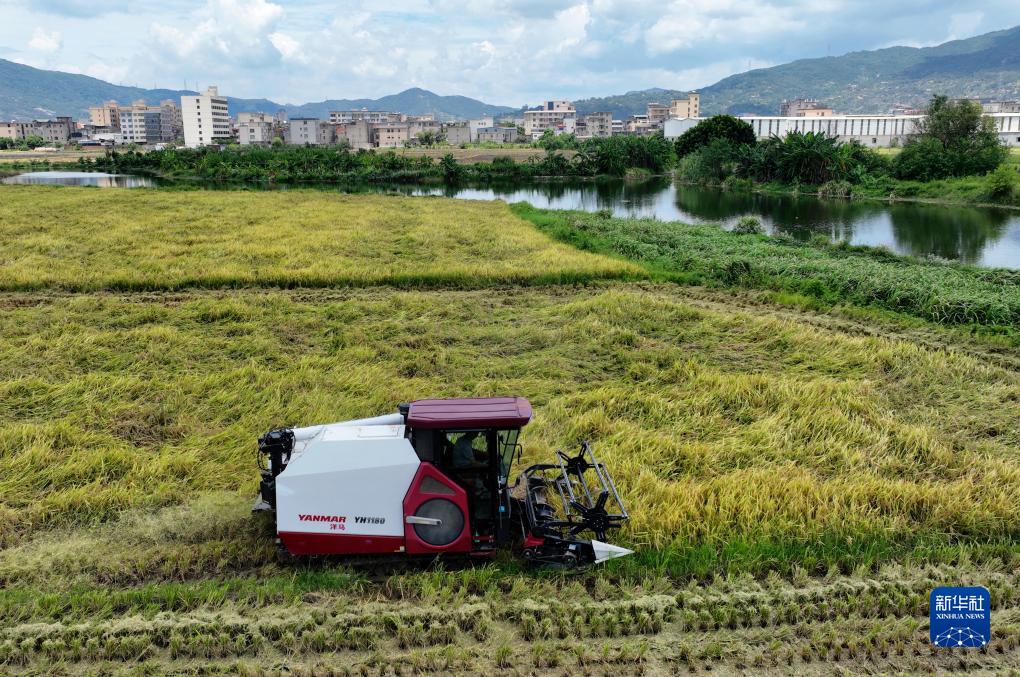 在福建省福州市長(cháng)樂(lè )區古槐鎮洋下村春欽農業(yè)專(zhuān)業(yè)合作社稻田,農民駕駛農機收割早稻(7月19日攝,無(wú)人機照片)。
