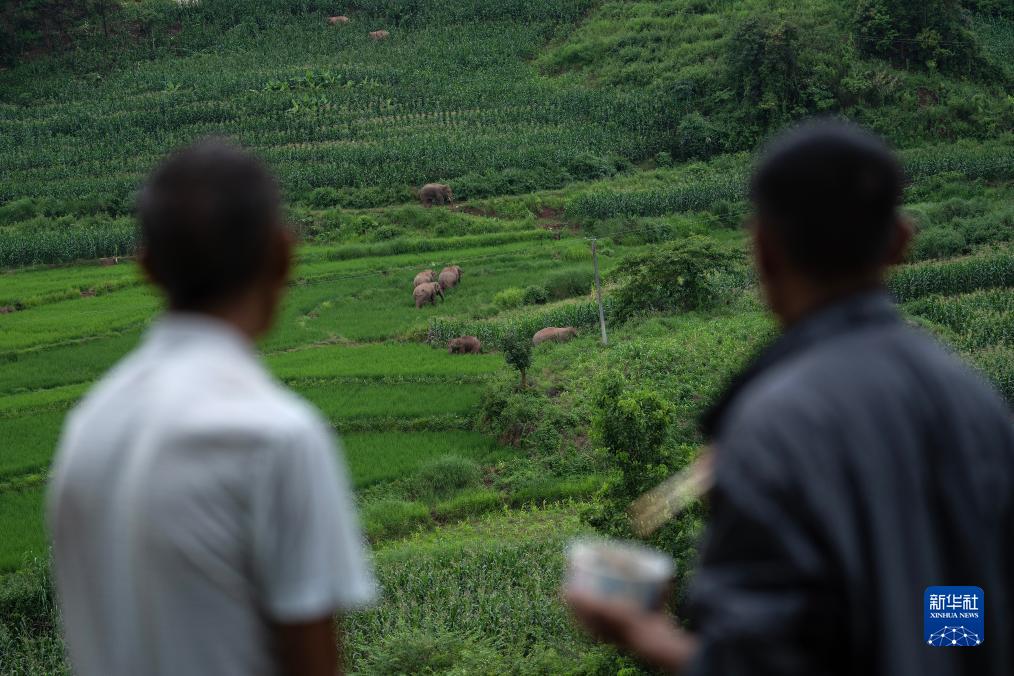 7月19日,兩名村民一邊吃飯一邊遙望遠處的象群。