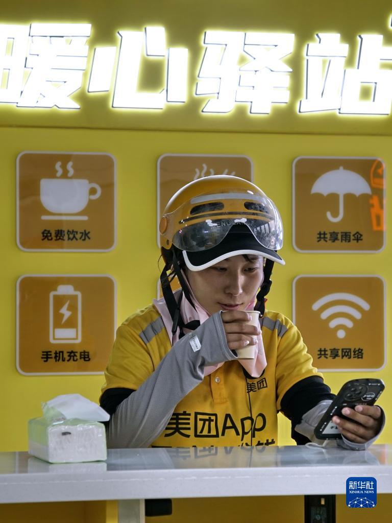 7月19日,一名外賣(mài)員在北京市大興區天宮院街道一家暖心驛站休息喝水。