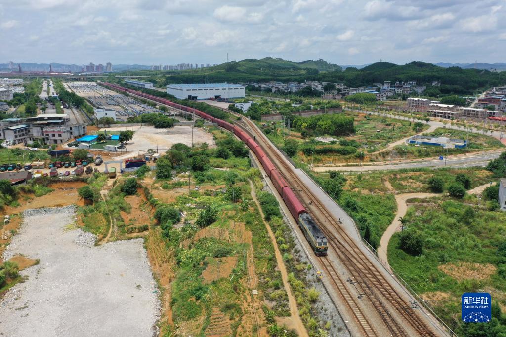 7月19日,滿(mǎn)載外運小汽車(chē)的貨運列車(chē)駛出廣西柳州雒容汽車(chē)物流基地(無(wú)人機照片)。