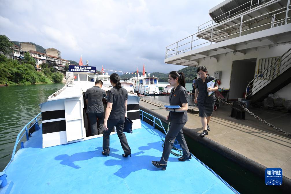 7月19日,安化縣人民法院干警在柘溪客運碼頭登上“水上法庭”。