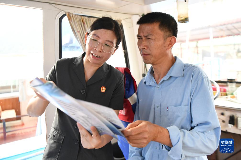 7月19日,安化縣人民法院干警(左)在柘溪客運碼頭旁一艘即將駛出的客船上進(jìn)行法制宣傳。