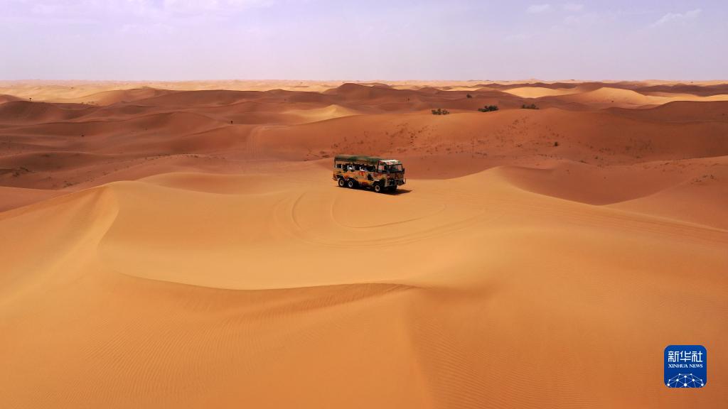 7月20日,游客在寧夏中衛市沙坡頭景區體驗沙漠沖浪車(chē)(無(wú)人機照片)。
