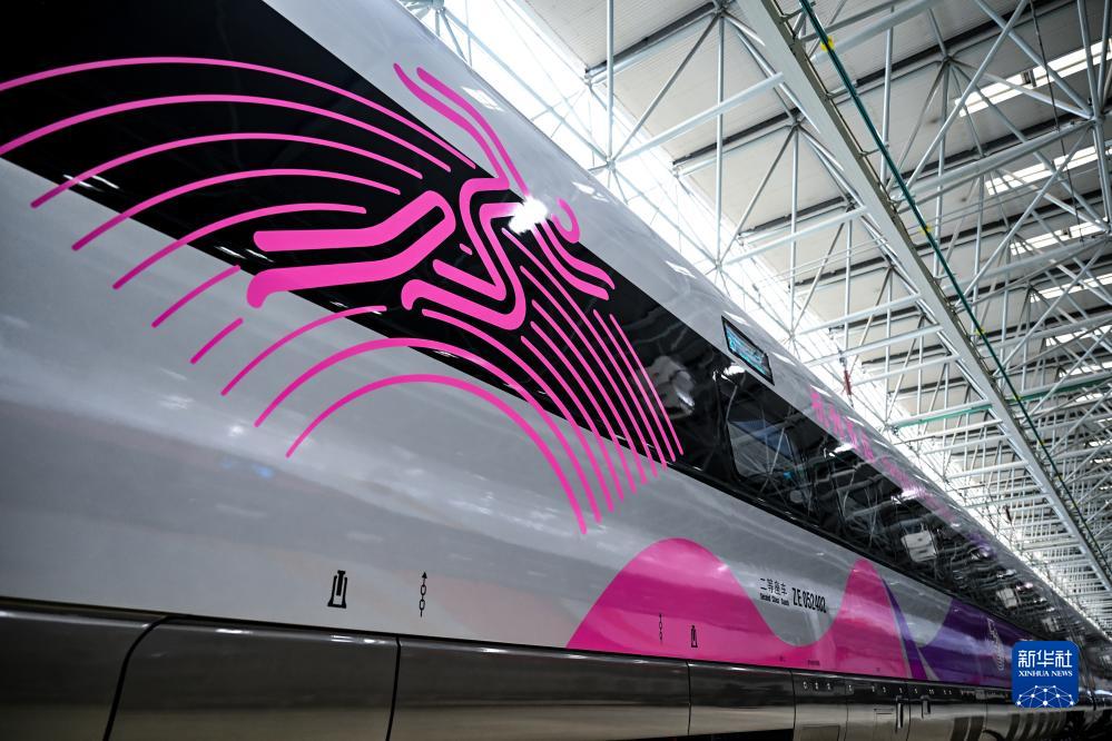 這是7月21日在中車(chē)長(cháng)春軌道客車(chē)股份有限公司拍攝的復興號亞運智能動(dòng)車(chē)組外觀(guān)。