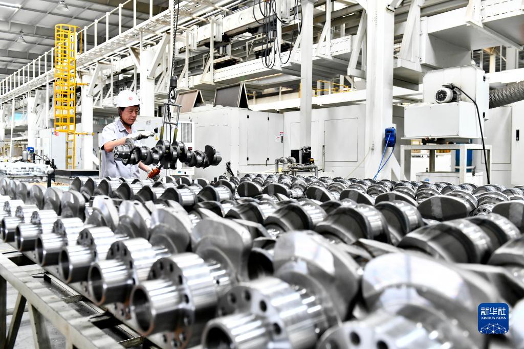 7月21日,在位于威海市文登區的天潤工業(yè)技術(shù)股份有限公司,工人在吊運曲軸產(chǎn)品。