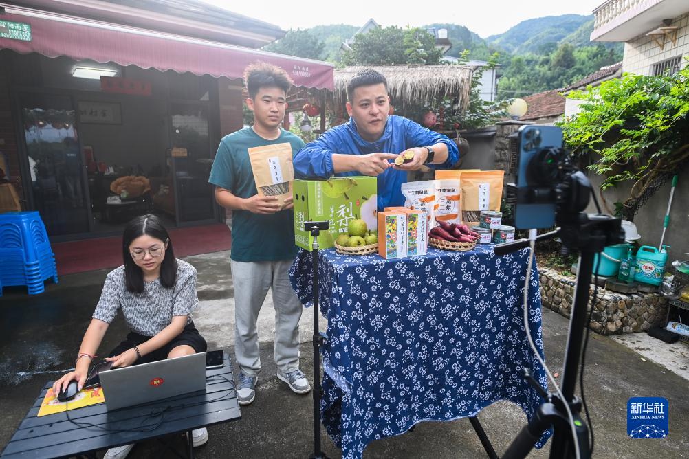 7月21日,在杭州市臨安區高虹鎮崇陽(yáng)村,何江南(右)和搭檔在直播銷(xiāo)售當地土特產(chǎn)。何江南回鄉后通過(guò)短視頻創(chuàng )作加帶貨直播形式,宣傳家鄉美食美景,實(shí)現村級土特產(chǎn)銷(xiāo)售和村民收入雙提升。