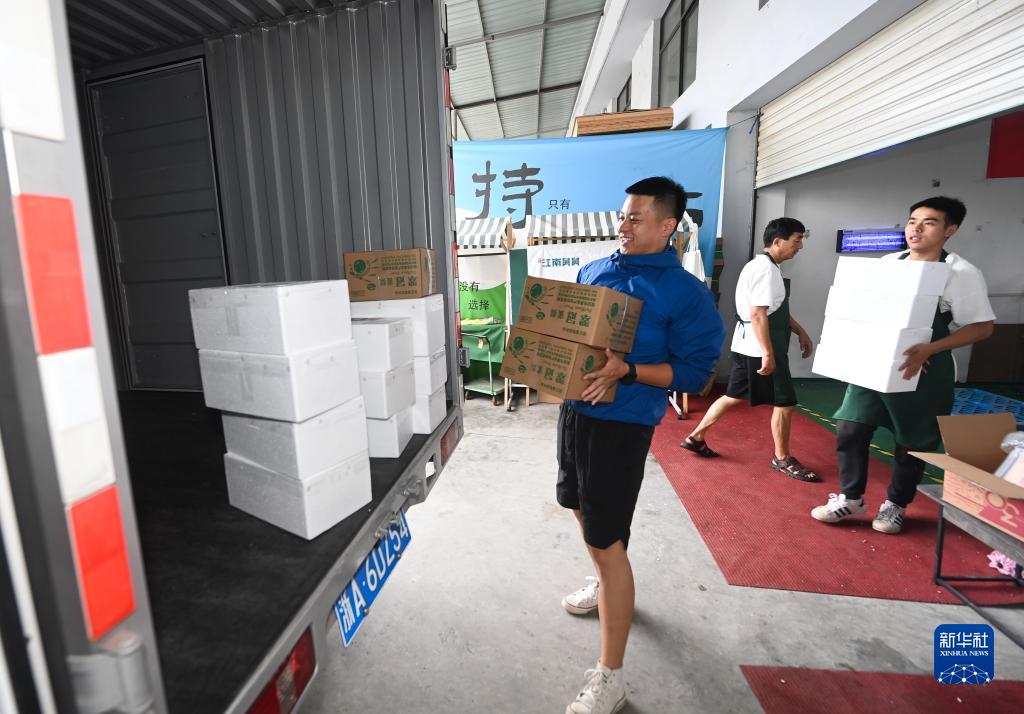 7月21日,在杭州市臨安區高虹鎮崇陽(yáng)村,返鄉創(chuàng )業(yè)的何江南(左)和村民一起裝車(chē)發(fā)貨。何江南回鄉后通過(guò)短視頻創(chuàng )作加帶貨直播形式,宣傳家鄉美食美景,實(shí)現村級土特產(chǎn)銷(xiāo)售和村民收入雙提升。